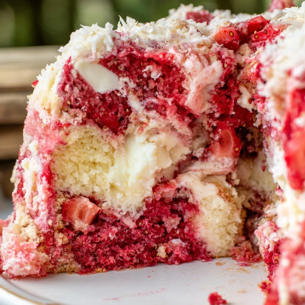 This indulgent strawberry cake features a unique marbled texture that creates pockets of creamy goodness throughout every bite. The combination of sweet strawberry cake mix, tangy cream cheese filling, and melted white chocolate chips results in a dessert that's both visually stunning and incredibly delicious.