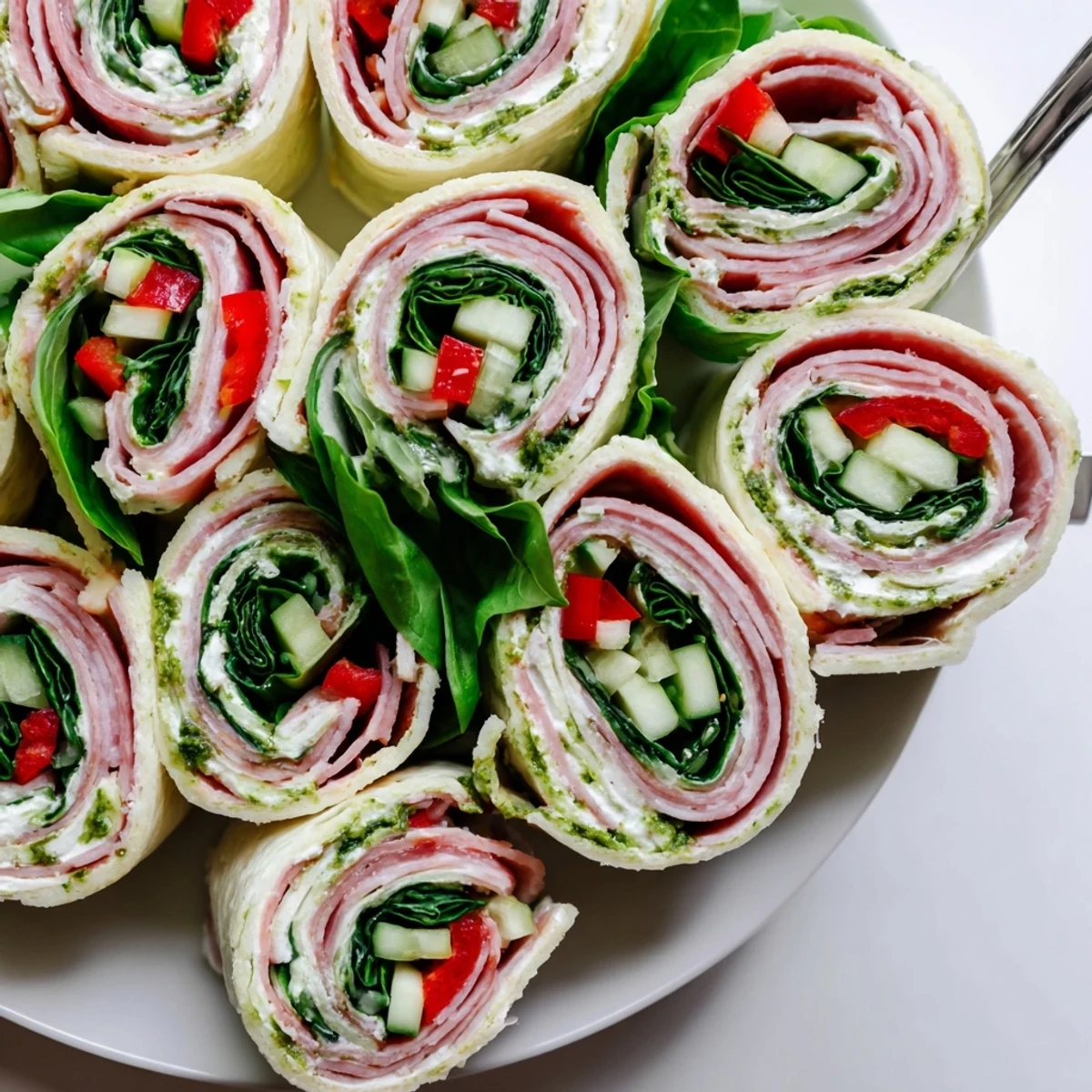 These Italian pinwheels layer pesto-spiked cream cheese, Genoa salami, smoked ham and provolone with diced bell pepper, cucumber and baby spinach. Spread the mixture on tortillas, roll tightly, chill to firm, then trim ends and slice into neat rounds. Make ahead and chill for cleaner slices; serve chilled or at room temperature garnished with basil.