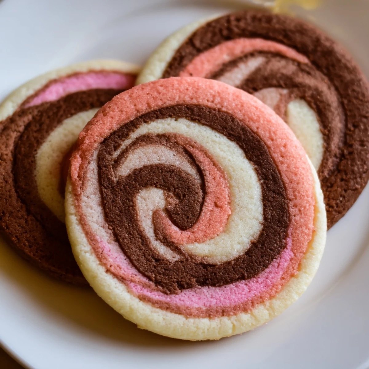 Create stunning tri-color spirals with these soft, buttery cookies featuring classic Neapolitan flavors. The dough divides into three portions—chocolate, vanilla, and strawberry—layered, rolled, and sliced to reveal beautiful pinwheel patterns. Perfect for gatherings, these treats combine visual appeal with delicious taste.