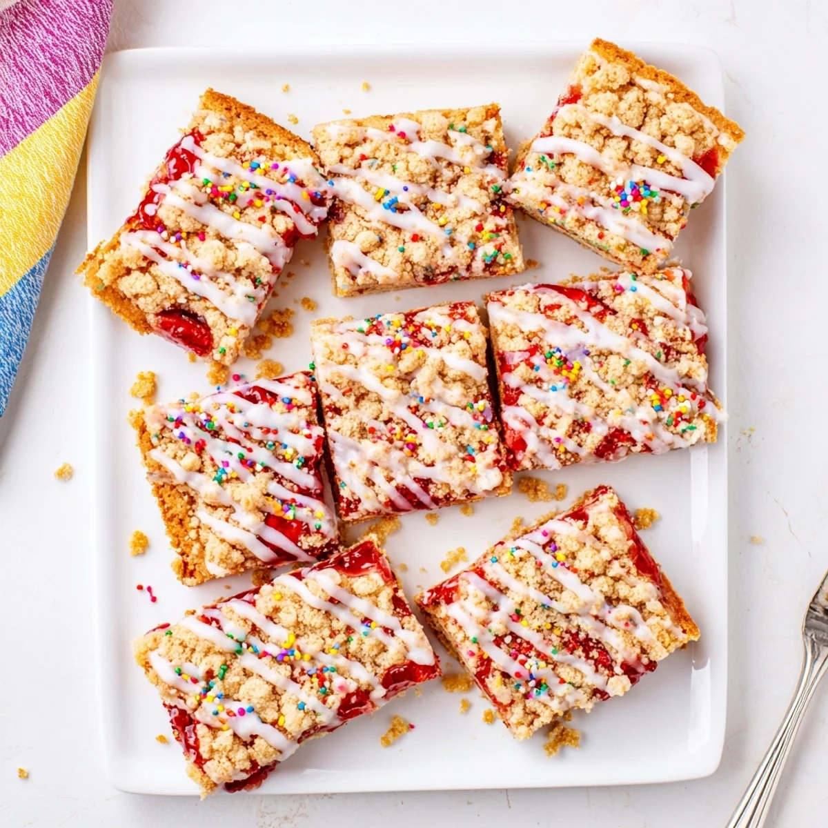 These nostalgic dessert bars combine the beloved flavors of classic toaster pastries with the comfort of homemade cookies. A soft, buttery sugar cookie base forms the foundation, topped with a generous layer of sweet strawberry jam and finished with a smooth vanilla glaze and playful sprinkles.