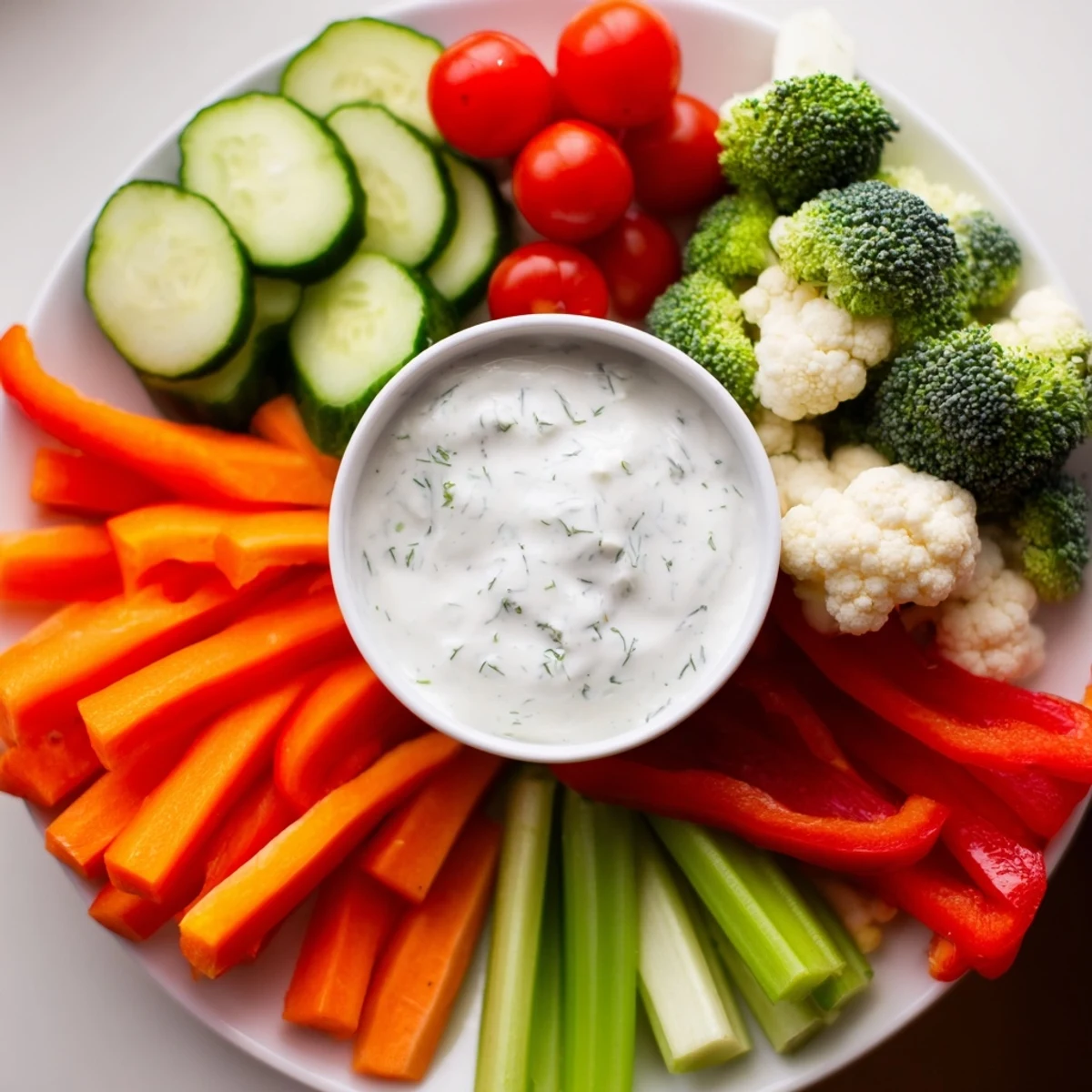 This vibrant veggie tray features an assortment of fresh carrots, cherry tomatoes, cucumbers, broccoli, cauliflower, bell peppers, and celery sticks arranged for easy serving. Accompanied by a rich ranch dip made with sour cream, mayonnaise, fresh herbs like dill, chives, and parsley, plus garlic and onion powder, this combination offers a fresh and creamy complement. Ideal for parties or quick snacks, it's simple to prepare and can be tailored with optional veggies or dairy-free alternatives.